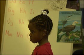 her first week away from her family, six-year-old Joyla Ingram struggles