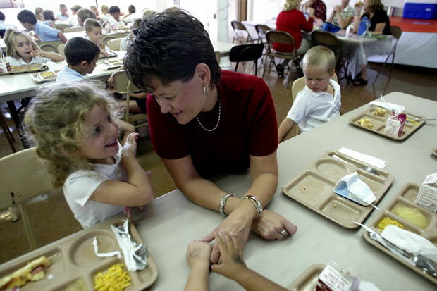 Pre-schooler "Hannah Banana" Bader gets some special attention from Mrs. Clingman after they finished their lunch together in the school cafeteria.