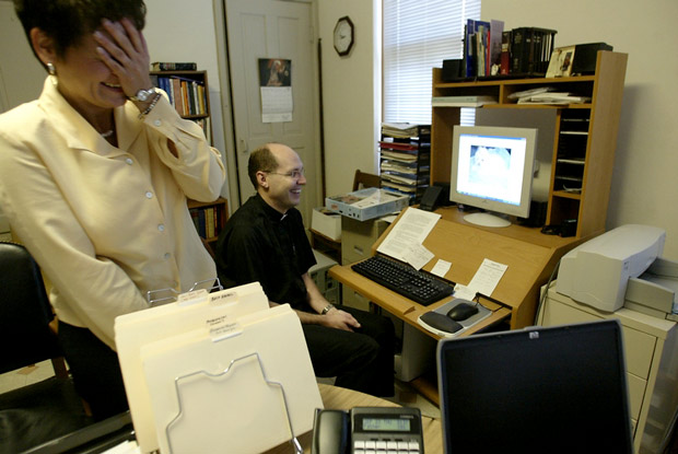 Rev. Bill Debo shows Mrs. Clingman a picture of the puppy he hopes to buy for the rectory. She, however, is not so sure.