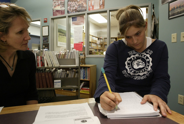 Graduating senior Ashlee Kiderlen, right, works on her letter of interest to college softball coaches as Mrs. Baumstark, the librarian at Hermann High, looks on. Ashlee asks for Mrs. Baumstark's help because all three of Mrs. Baumstark's daughters who have graduated high school have gone on to play college sports.