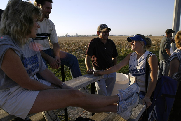 Ashlee Kiderlen, right, greets her parents Paula, left, and Doug after a softball game in Montgomery City. Her parents attend all of her games, often accompanied by her uncle and grandparents.