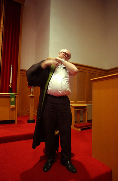Readying for another day and another sermon, Pastor James Elliot dons his robe in the sanctuary at St. Paul United Church of Christ in Hermann, Missouri.