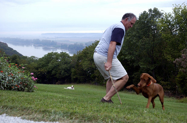 Sam Frink plays with his hunting dogs Maggie and Molly on his property overlooking the Missouri River. "They are good dogs," said Frink. "They won't go very far from me if I am out here. They stick close."