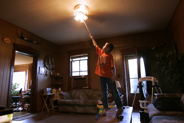 Jonathan amuses himself by switching the ceiling fan on and off at his grandmother's house.