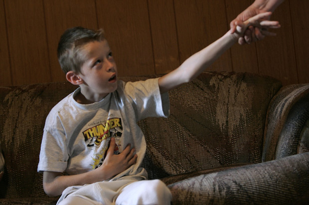 Assisted by his grandmother, Joy Towery, Jonathan is effected by the medication that causes his heart rate to escalate.