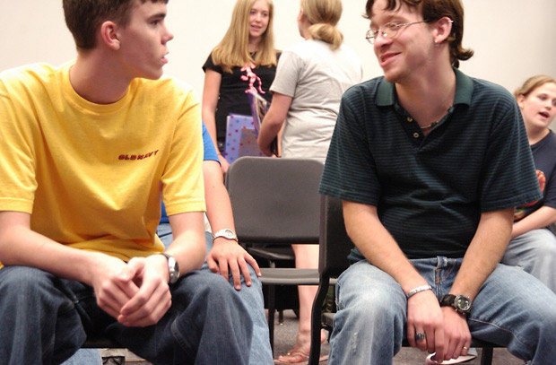 In choir class, a friendly conversation offers a chance to relax.