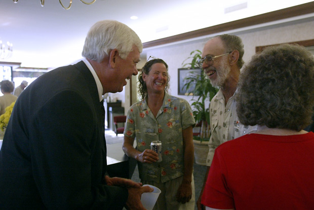 Berkemeyer shares a laugh with high school friend Forrest Oclschlaeger and Valerie Pearce at the Bay-Hermann Berger Bank customer appreciation open house where Berkemeyer serves on the board.