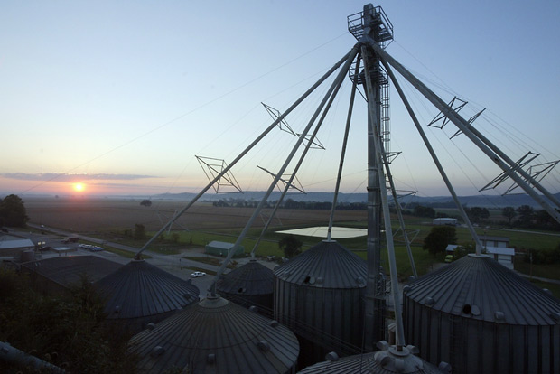 A grain leg towers over a sun soaked sky. In many small communities the grain elevator like the church steeple or water tower is a visible landmark for miles.