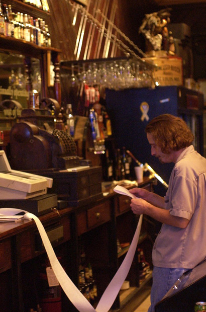 Life Goes on in Downtown Hermann Michael Romick of The Concert Hall and Barrel Bar checks the receipts after a busy evening. The Concert Hall is the oldest continuously operated bar west of the Mississippi River, first opening in 1878--and the only real constant on First Street. [10 of 11]