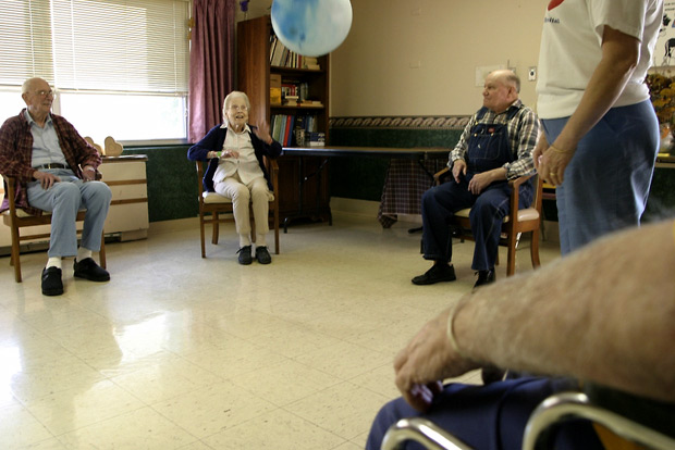 Choosing to Live Rilla Shearmire, 97, center, practices ball exercises at the Hermann Area District Hospital. Rilla is the only female strong enough to participate in this activity. Every other day, the residents of the hospital gather at the recreation room daily activities. [3 of 12]