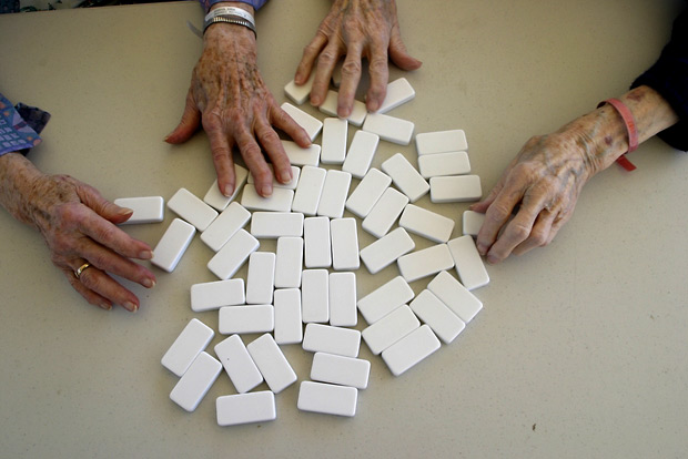 Most every afternoon, Rilla plays dominoes with her friend Emma Gumper. She regularly beats her opponent.