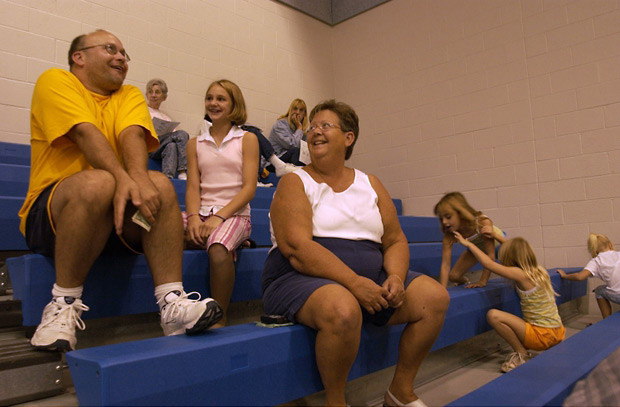 Vernon works out new costume ideas with 11 year old Corby Hackmann and Pat Buschmann at a junior varsity volleyball game. A cooked turkey outfit was suggested for next Thanksgiving.
