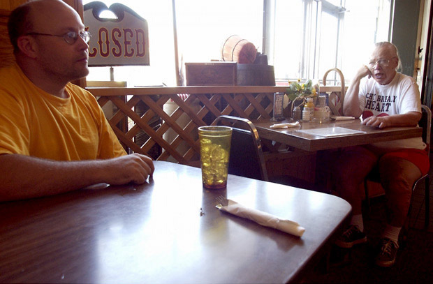 Mother and son have dinner at the Rivertown Restaraunt. Martha doesn't like to sit in booths, so she talks to her son about the day's events from across the table.
