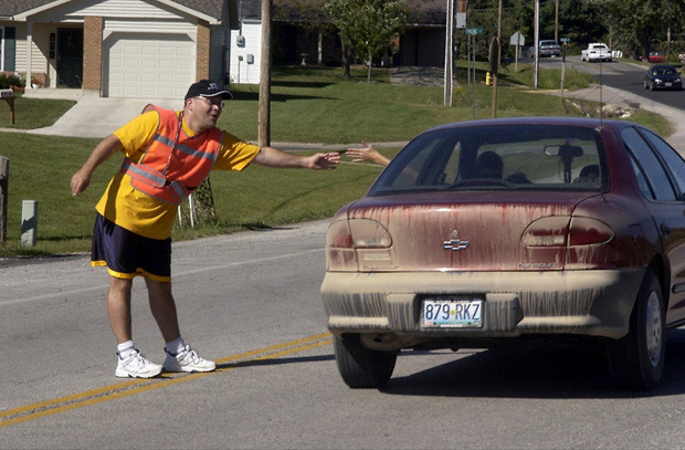 Drivers wave and shout greetings at their daily traffic director. Vernon helps cut down on accidents in the after school rush.