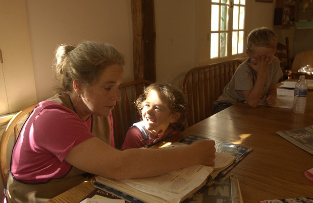 Jan Kent teaches basic reading to five-year-old Quinn while Graham, eight, struggles with his handwriting exercises.