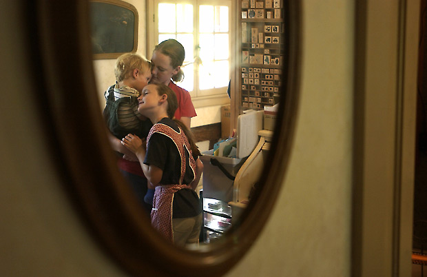 Reflected in a mirror, Ellery, 10, hugs her little brother, Clark Anders, 2, and her older sister, Sadie, 12.