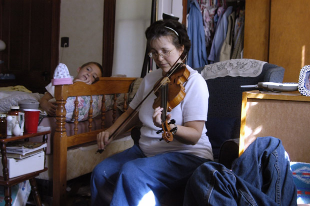 The mother of eight children, Nancy Monahan, 45, uses violin music to relax. She trained and studied classical music.