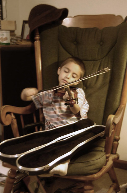 Like his siblings, Peter loves music, but his fingers aren't big enough for much more than a Suzuki violin. Mom Nancy teaches all the children music, as well as all their other home-school courses.