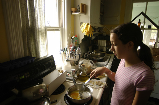 Laura, 13, cooks breakfast, eggs from their own hen house.
