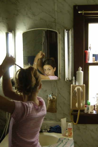 Laura styles her hair before jumping in the family van for a trip to Warrenton, Mo., to hear Vice President Dick Cheney talk.