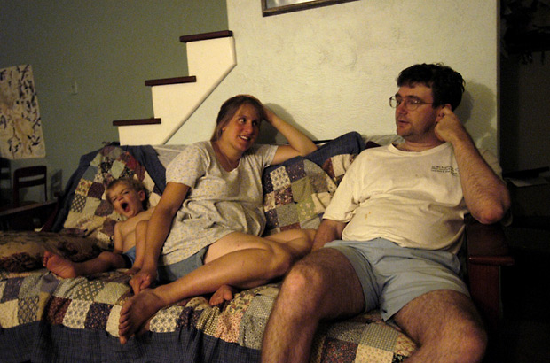 TJ lets out a big yawn as Sharla and Lance talk late into the evening.
