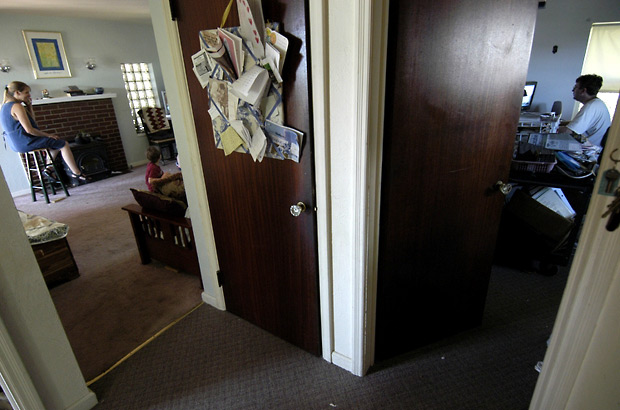 Sharla handles a midday call about the bed and breakfast while Lance works steadily in his home office.