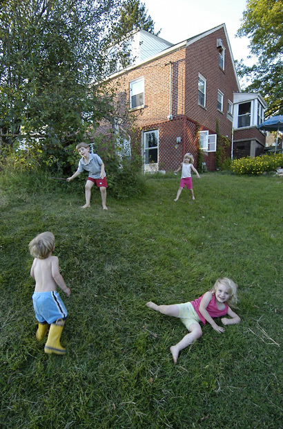 Isaac, Jewel, TJ and Alisha tumble down a hill in the backyard.