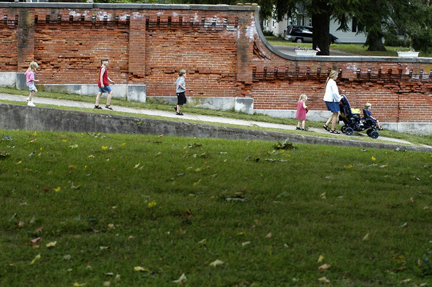 Sharla pushes TJ in a stroller as Alisha, JD, Isaac and Jewel follow behind.