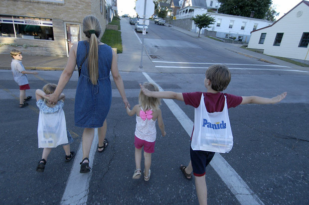 Sharla's Brood Sharla, Jewel, Isaac, Alisha and JD walk home after running some errands. Jewel and Isaac carry books from the library and some items from the hardware store in bags on their backs. [9 of 11]