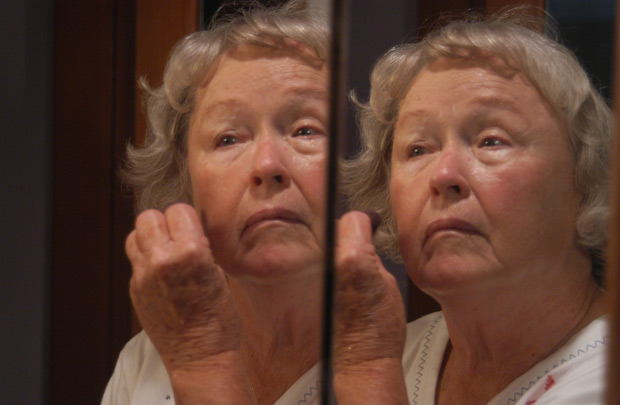 Marjorie Greene, 76, applies make-up at home readying herself before heading to Hermann High School to accompany a choral class.