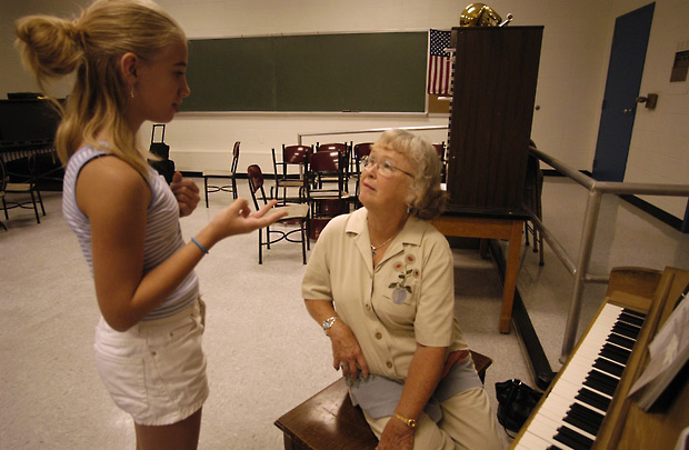 Marjorie converses with a student at the middle school after rehearsal. Many of her piano students, former and current, say hello to her during her time on campus.