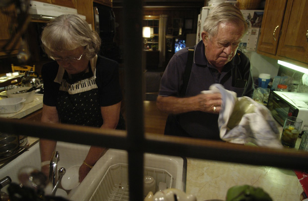Marjorie and her husband Jack wash dishes after dinner. Jack helps with dishes less often when a baseball game is on the television.