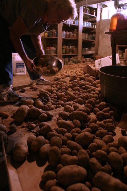 Little River Bottom Marilyn collects the homegrown potatoes she stores on the ground of the farmhouse cellar to make supper. Few people nowadays single-handedly cans and stores all the food they produce including sauerkraut, jams, vegetables, fruits and meats. [5 of 11]