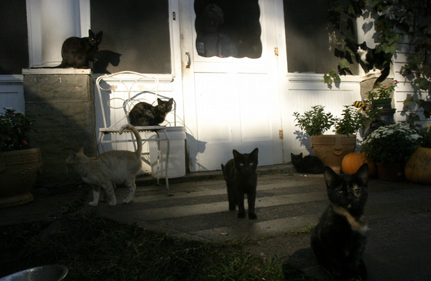 Cats linger and await by the front porch for food. All twelve of them share the yard with two dogs, a duck and two turkeys.