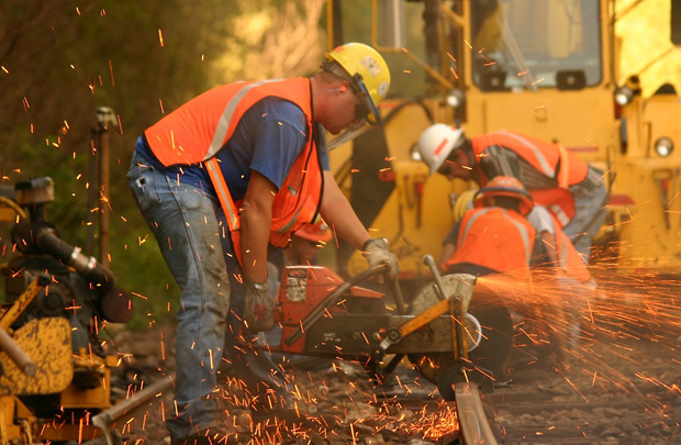 Spiker helper, Wesley Ward, saws through a section of old rail to be pulled and replaced with new.