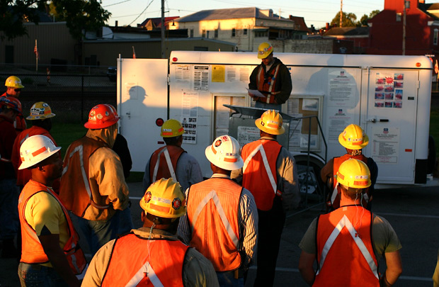 The crew's day begins with a morning safety briefing at 6:30 sharp.