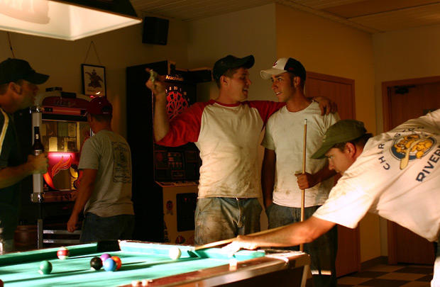 Crane operator, Greg Hicks, debates pool with Charlie Bishop as spiker operator, Brad Sly, cues it up.