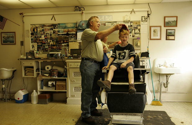 FRIENDS FOR LIFE: Like one of his regulars believes “I’ve never met a stranger ” all the boys and men in town know early on that they can trust Larry. With all of Larry’s grandchildren prominently displayed on the mirror behind, 7 year old Joe Broeker sits elevated above the chair; with his large hands Larry gingerly removes the boys ball cap.