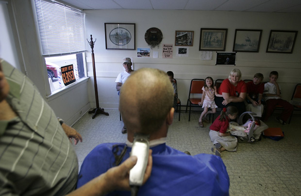 FAMILIAR GROUND: With his family watching from across the room, Charlie Hymes feels the familiar touch as an electric razor splits the stubble on the back of his head.