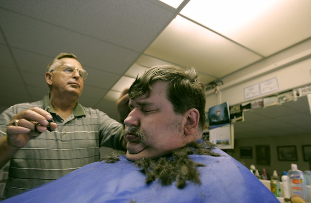EVERYONE’S WELCOME: Dennis Rinne rests comfortably as his friend Larry give him a long over due trim.
