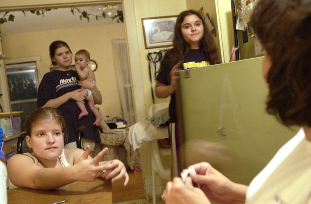 Alicia, Amanda, her six-month-old son Colton Towery, Amy, and Wright fix sandwiches for dinner Thursday. Wright doesn't get home until 8:00 p.m. most nights so dinner is usually something quick.