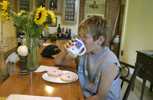 Parker eats a quick breakfast, including a few gulps of apple juice, before heading out to the vineyard to help with the harvest.