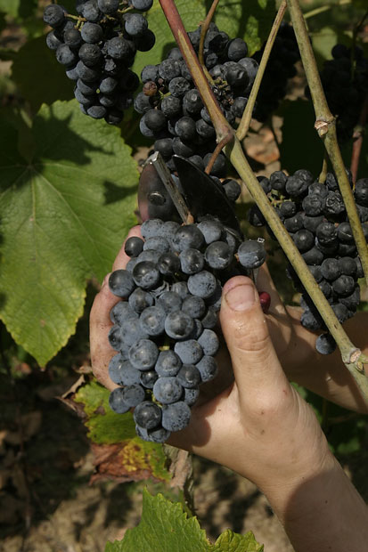 Parker Puchta, his hands showing the wear and tear from hours of harvest, cuts a bunch of Norton grapes.