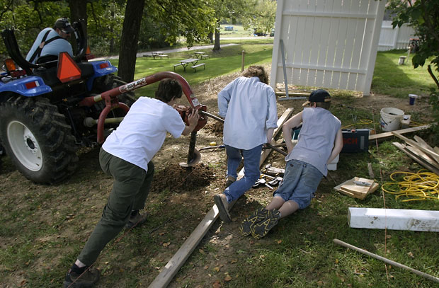 Seated atop his tractor, Parker's father Tim Puchta digs a fence post hole as (from left) Gena Valli, Vicky Puchta and Parker apply pressure to help the drill penetrate the hardened earth.