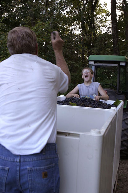 After a long day of work, James Pohlman tosses grapes as Parker tries to catch them in his mouth.