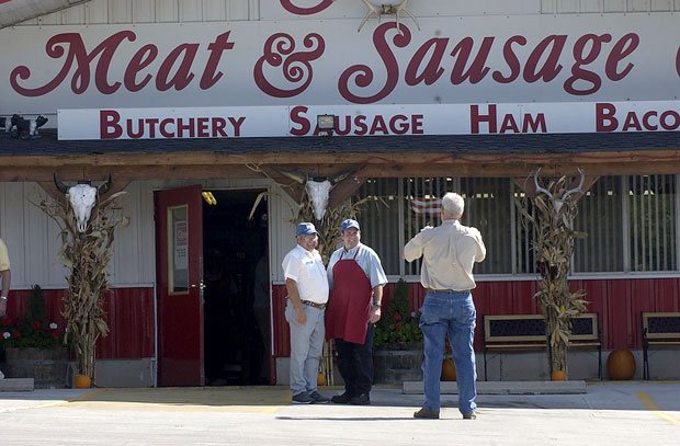 Mike Sloan's Wurst Case Scenario Bill Sloan, left, and his son, Mike Sloan, center, are photographed outside their butchering and sausage shop by Gene Oitker, right, after giving a tour of the plant. Bill Sloan opened the Swiss Meat and Sausage Shop in 1969, which is now managed by Mike Sloan. [1 of 7]