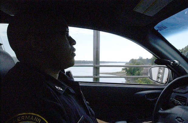 Hermann, Missouri's only African American police officer Marlon Walker leads a funeral procession of cars across the Highway 19 bridge on the morning of September 23, 2004.