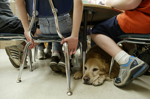 Tucked between squriming feet, Roper gets comfy during class.
