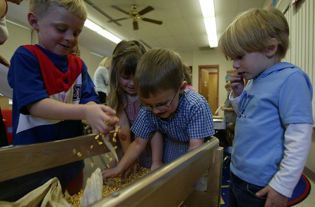 While her classmates play with shucked corn, McKenzie Fanguy stands off to the side and only watches.