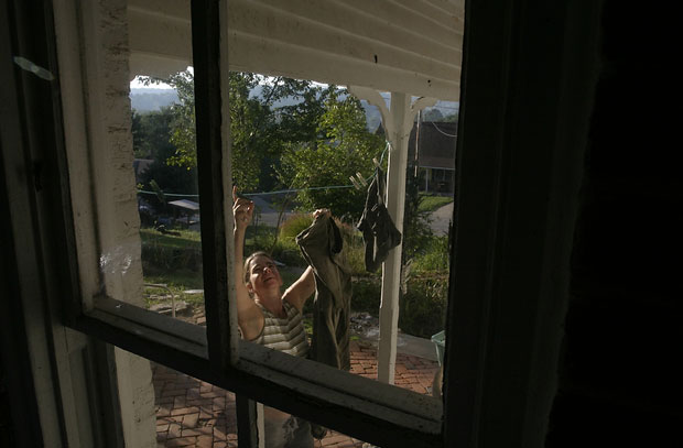 Joey hangs out the laundry on a sunny morning.